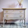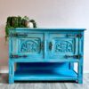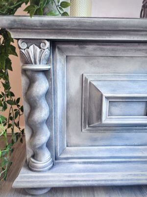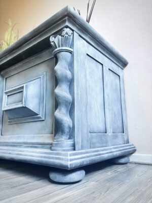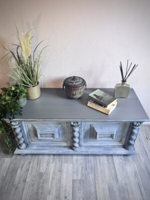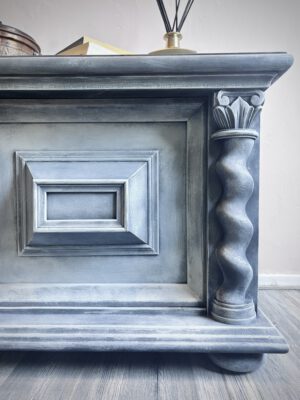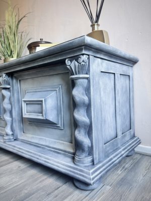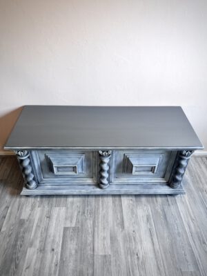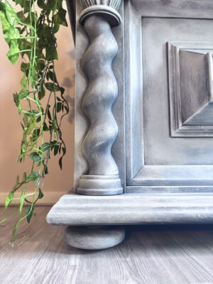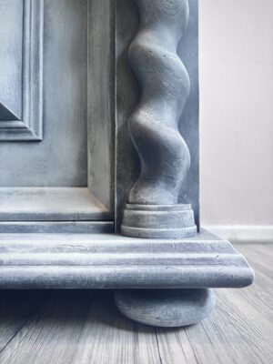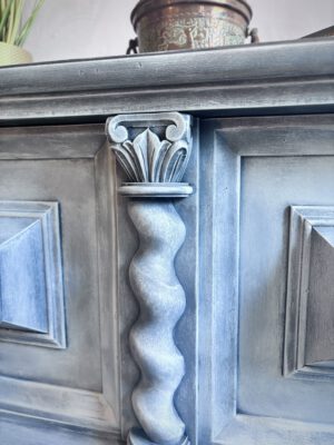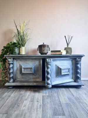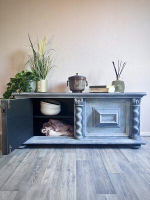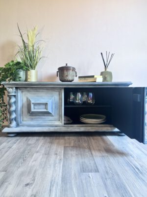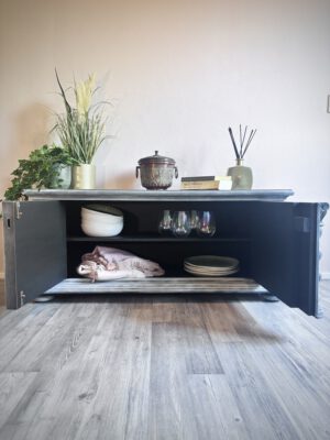 Oorspronkelijk een donkere eikenhouten kast, nu getransformeerd tot een industrieel dressoir met een unieke bohemian, steenachtige uitstraling. De onderkleur is volledig matzwart geverfd. Vervolgens is met een lichtgroene verftint de dry brushing-techniek ingezet, zodat een verweerd oppervlak gecreëerd kon worden. Het doet denken aan een subtiel Disney-decor; speels, vriendelijk en licht. De binnenzijde is eveneens matzwart afgewerkt, wat het contrast met de buitenzijde versterkt. De originele sluitingen zijn behouden gebleven: links vergrendel je de deur met schuifslotjes aan de boven- en onderzijde, rechts sluit je de kast met een houten schuifje. Een solide en stijlvol meubel met een industriële touch.