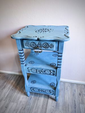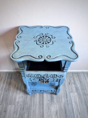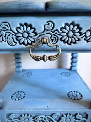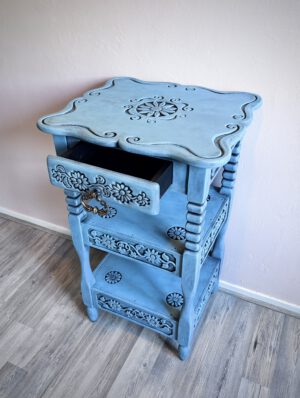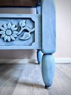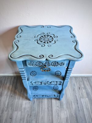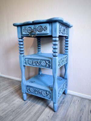Dit sprookjesachtige en karaktervolle kastje van 84 cm hoog is met zorg gerestyled in een zachte poederblauwe kleur, over een diepe onderlaag van zwart. De bloemen die in het hout zijn gekerfd, zorgen voor een subtiel reliëf en geven het stuk extra diepte en textuur. De gelaagde afwerking laat de vormen mooi naar voren komen en maakt van dit kastje een echte blikvanger. Een stijlvol en uniek meubel dat zowel in een klassiek als modern interieur tot zijn recht komt.