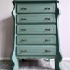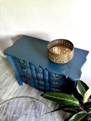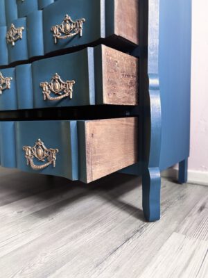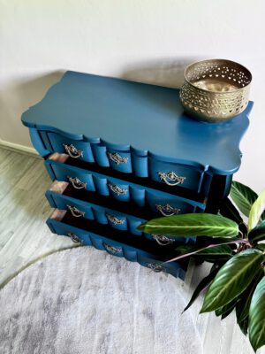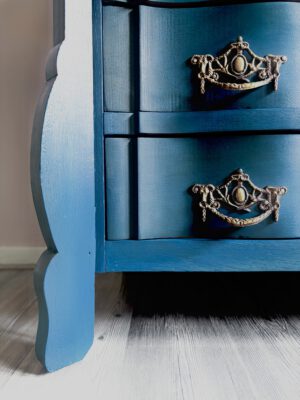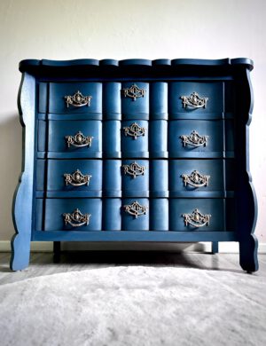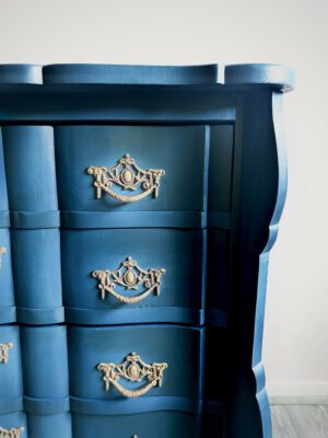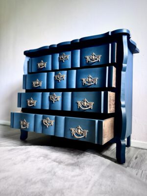 Maak kennis met deze prachtige donkerblauw buikkast, een ware blikvanger voor je interieur. Deze klassieker heeft een stijlvolle transformatie ondergaan, waarbij elk detail met zorg is behandeld. De meubelgrepen zijn voorzichtig verwijderd, zorgvuldig opgepoetst en weer teruggeplaatst, waardoor ze schitteren als nieuw. Vervolgens is de kast met de hand geverfd in een diepe, elegante donkerblauwe tint met de naam Avondblauw, die perfect aansluit bij zowel moderne als klassieke interieurs. De verflaag accentueert de prachtige rondingen van de kast, terwijl de glanzende grepen een luxe touch toevoegen. Sommige gedeeltes zijn afgewerkt met de donkere meubelwas van Rust-Oleum om meer diepte te creëren. Daarna is het hele kastje behandeld met Rust-Oleum’s transparante meubelwas. Met deze unieke buikkast voeg je een vleugje tijdloze elegantie toe aan je huis!