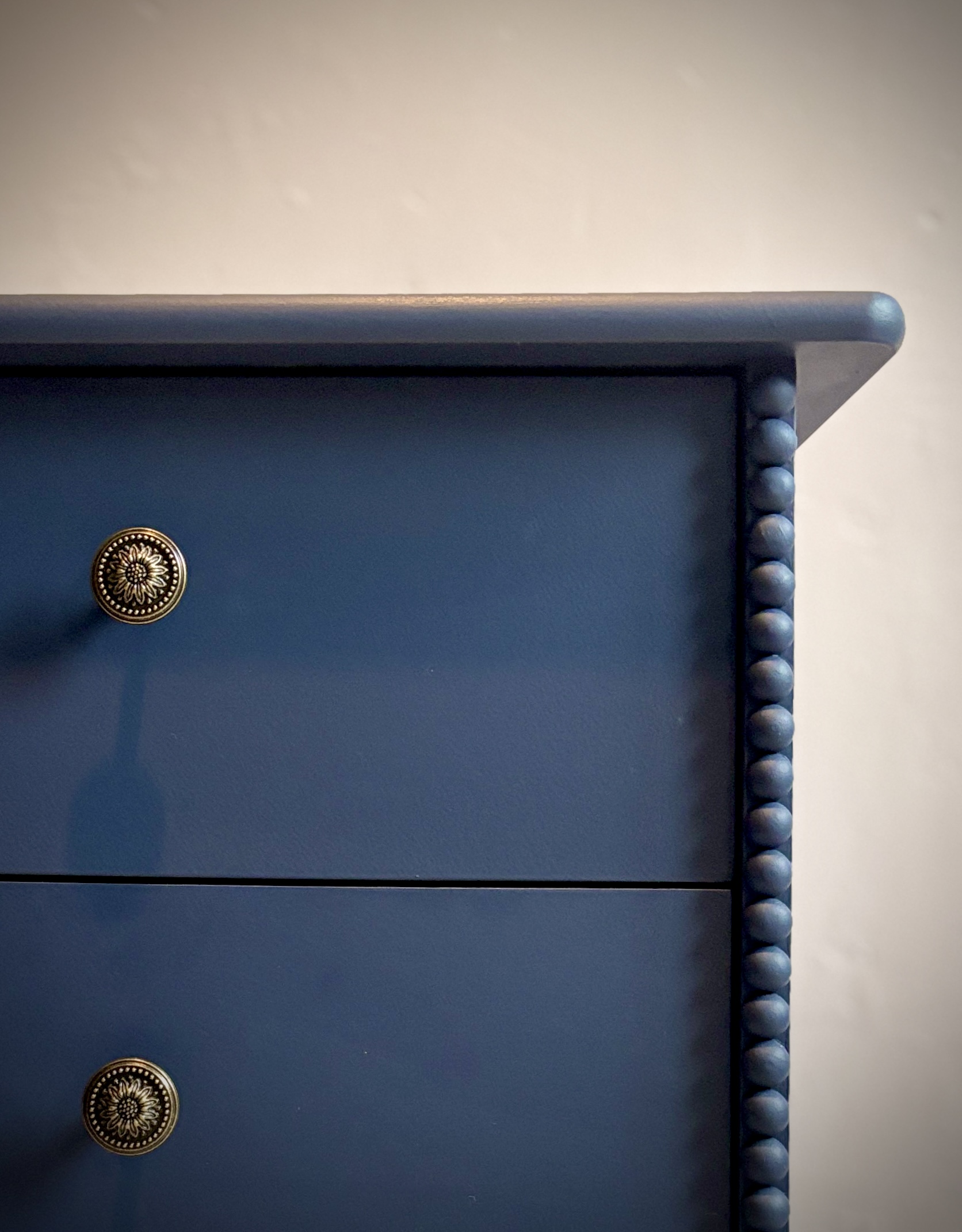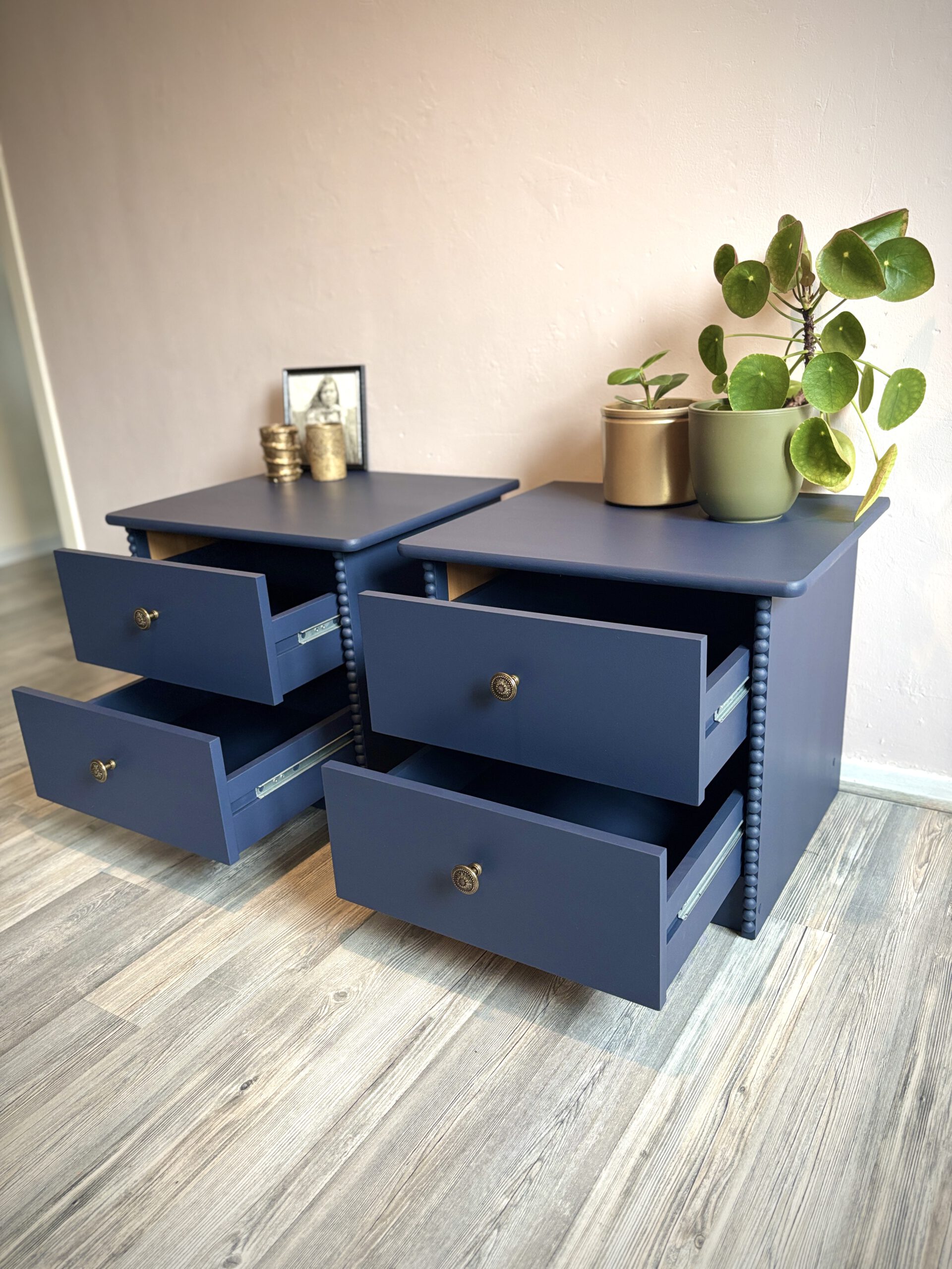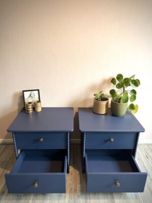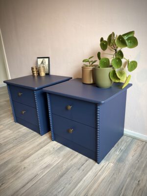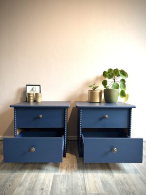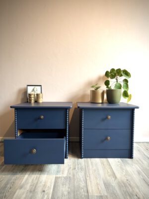 Deze set nachtkastjes heeft een compact formaat en is daardoor eenvoudig naast het bed te plaatsen. De voorzijde van de zijkanten is met de hand afgewerkt met een verticale strook houten halve bolletjes, wat zorgt voor een subtiel klassiek detail. De kastjes zijn volledig uitgevoerd in dezelfde donkerblauwe kleur, tot en met de binnenzijde van de lades. Dit zorgt voor een rustig en verzorgd geheel tot in de details. De bronzen meubelknoppen met hun fijne patroon geven het geheel een luxe en verfijnde touch.
