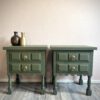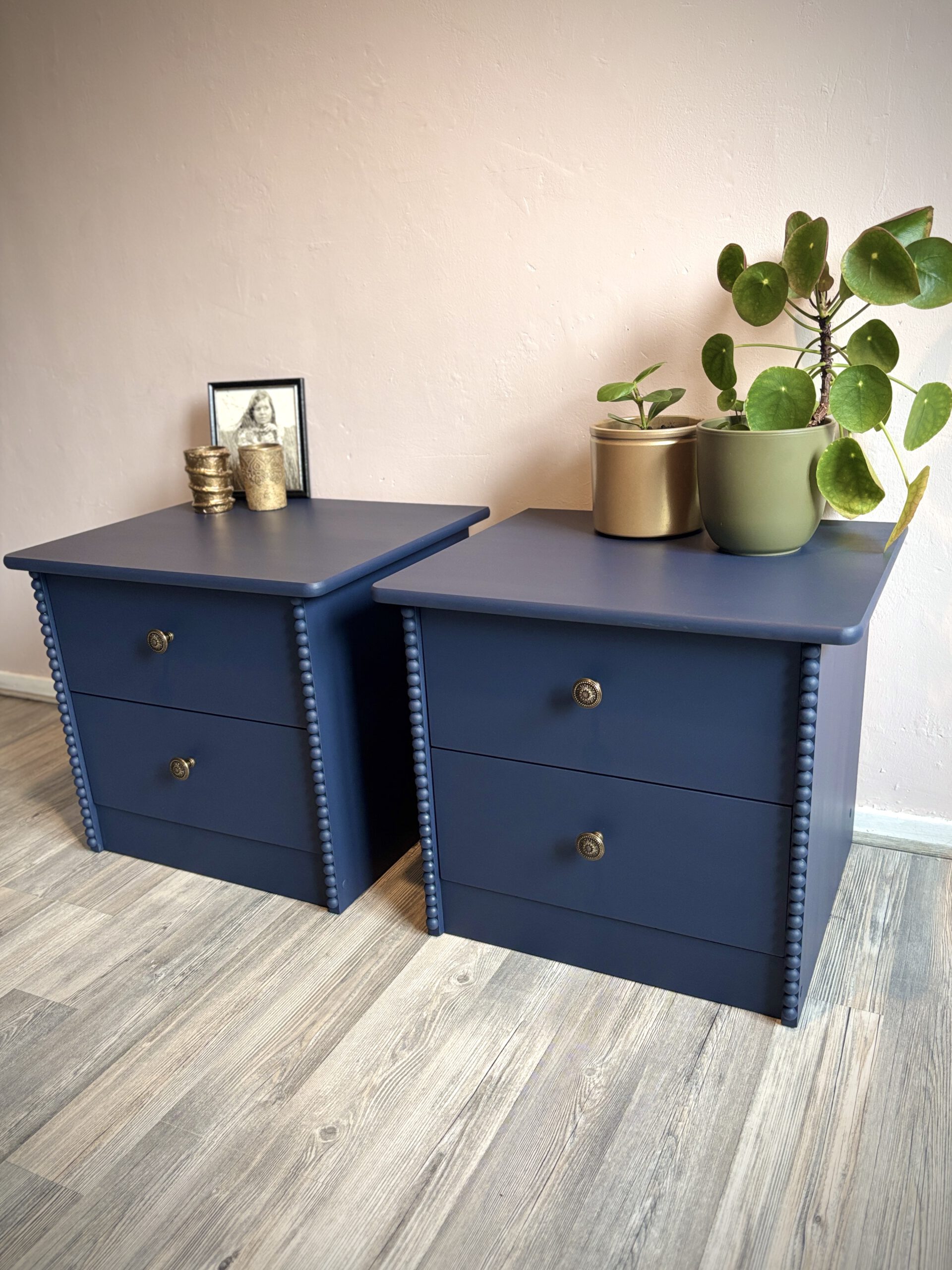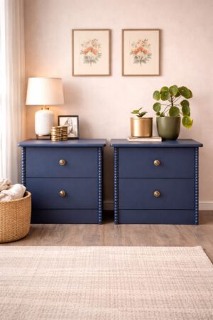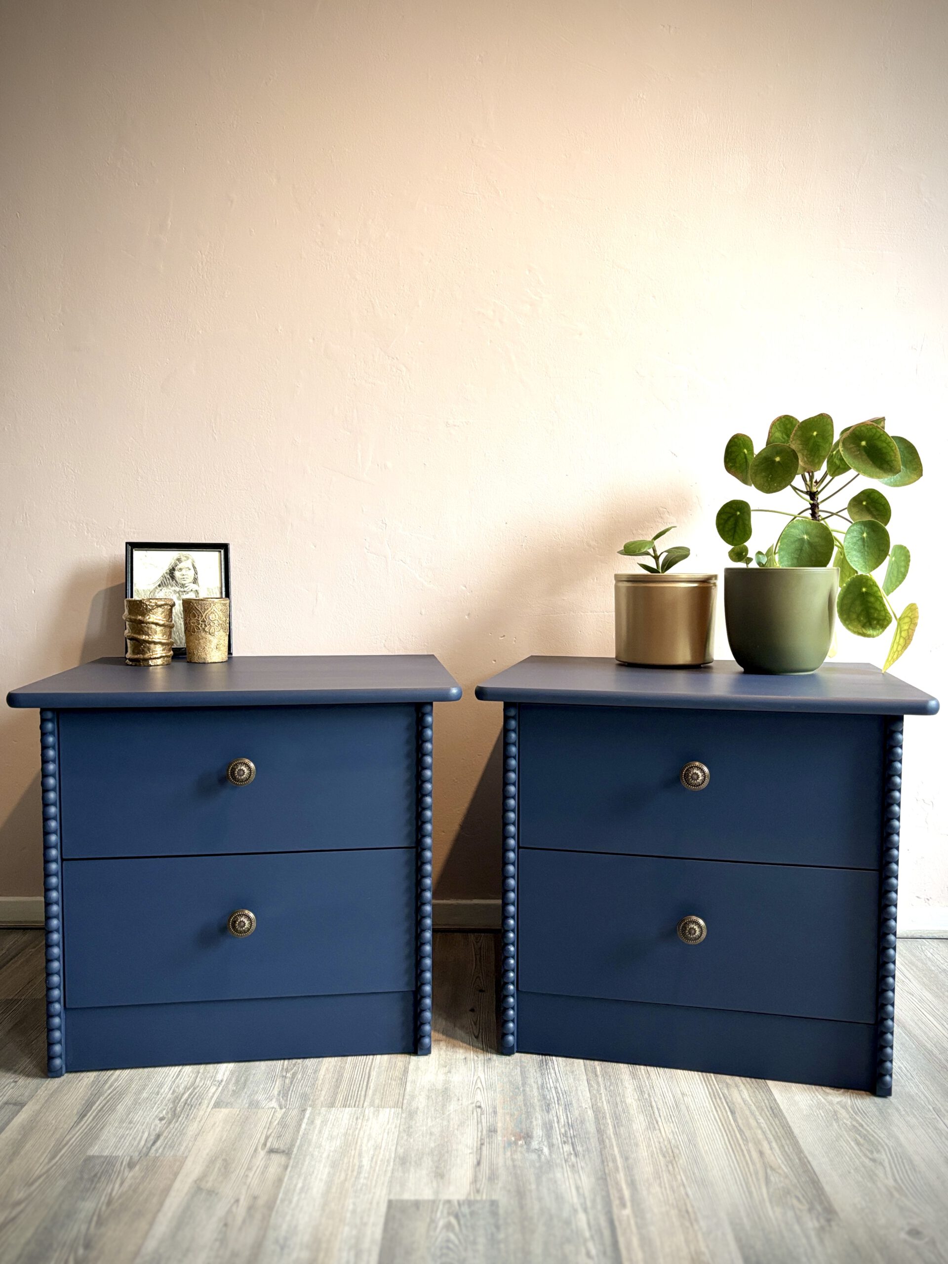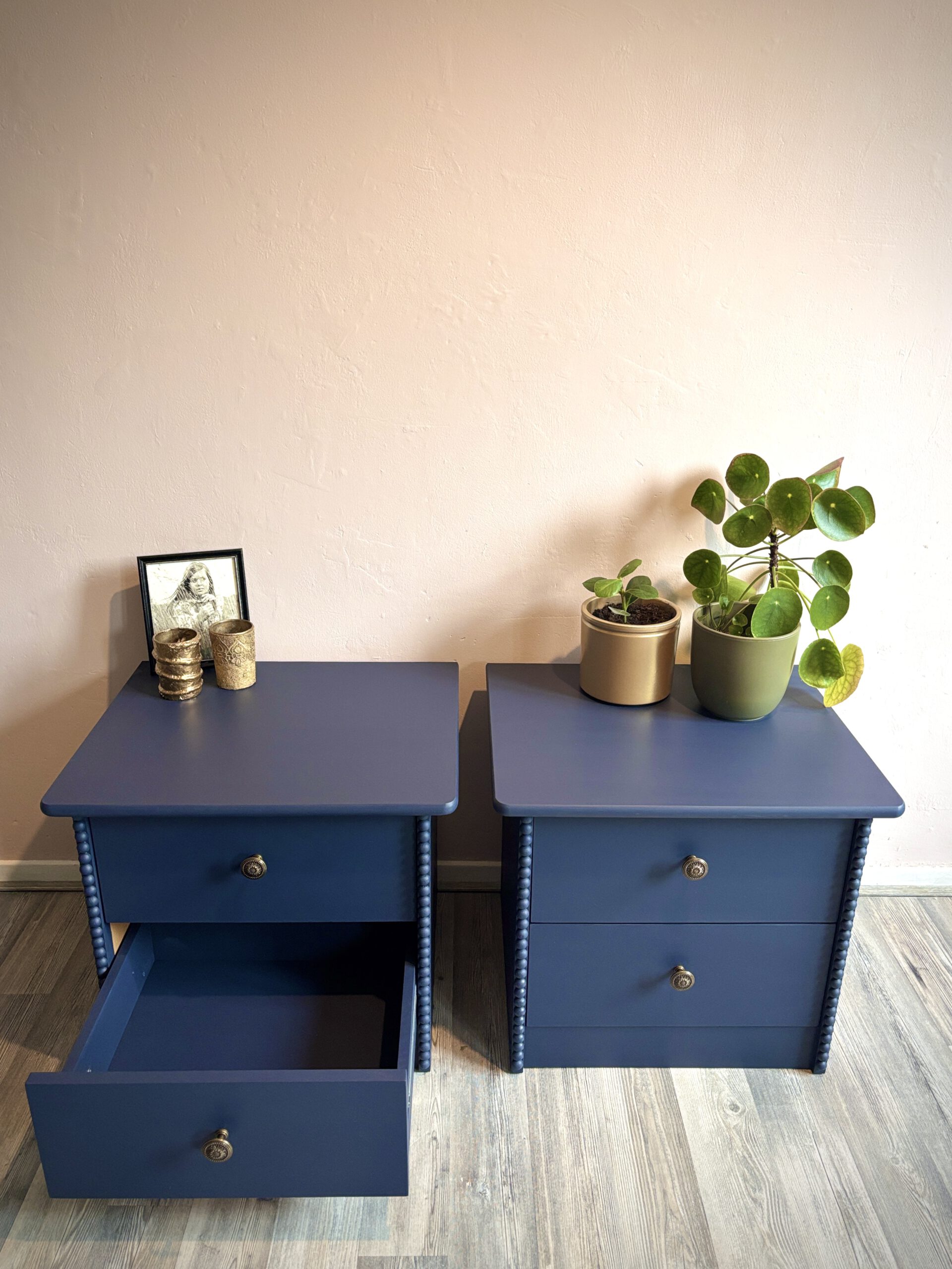 Deze set nachtkastjes heeft een compact formaat en is daardoor eenvoudig naast het bed te plaatsen. De voorzijde van de zijkanten is met de hand afgewerkt met een verticale strook houten halve bolletjes, wat zorgt voor een subtiel klassiek detail. De kastjes zijn volledig uitgevoerd in dezelfde donkerblauwe kleur, tot en met de binnenzijde van de lades. Dit zorgt voor een rustig en verzorgd geheel tot in de details. De bronzen meubelknoppen met hun fijne patroon geven het geheel een luxe en verfijnde touch.