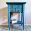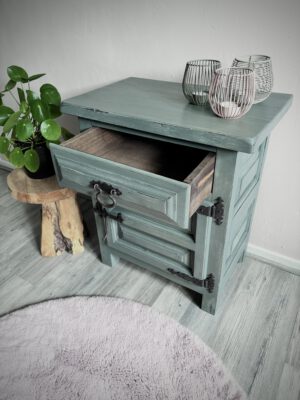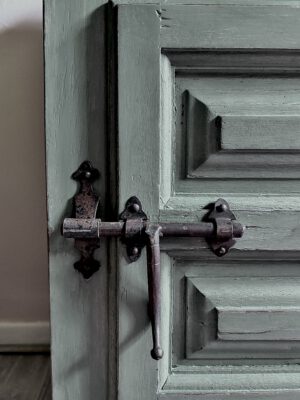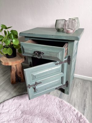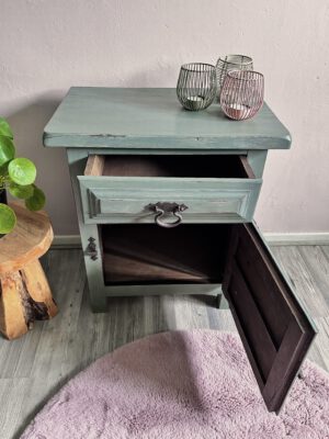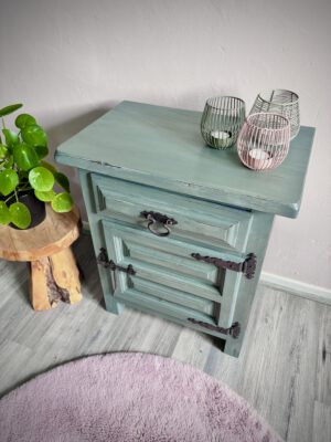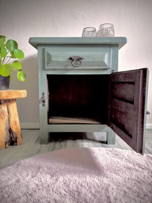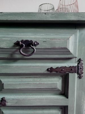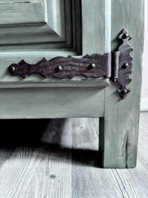 Voor de eerste verflaag is gekozen voor de kleur Grafiet, waarmee een diepe, donkere ondertoon ontstaat. Daarna zijn twee lagen zorgvuldig aangebracht: eerst in Krijtgroen, gevolgd door Sereniteit, dat nu de hoofdrol speelt als dominante kleur. Om een authentiek vintage effect te bereiken, is het kastje voorzichtig licht opgeschuurd, waardoor de onderliggende lagen subtiel zichtbaar blijven. Het geheel is afgewerkt met een donkere meubelwas van Rust-Oleum, die de kleuren extra diepte en warmte geeft. Het roestige beslag is bewust in zijn oorspronkelijke staat gelaten, wat het vintage karakter van dit unieke stuk nog krachtiger benadrukt. Zo is dit kastje uitgegroeid tot een sfeervolle, tijdloze blikvanger!