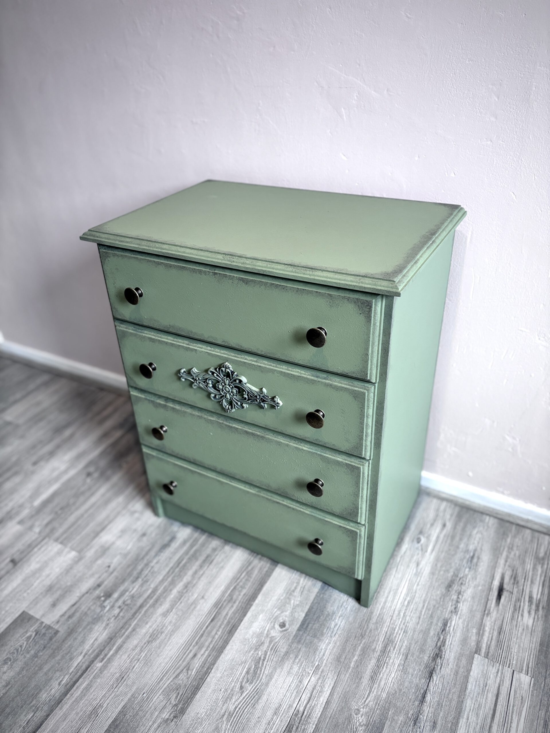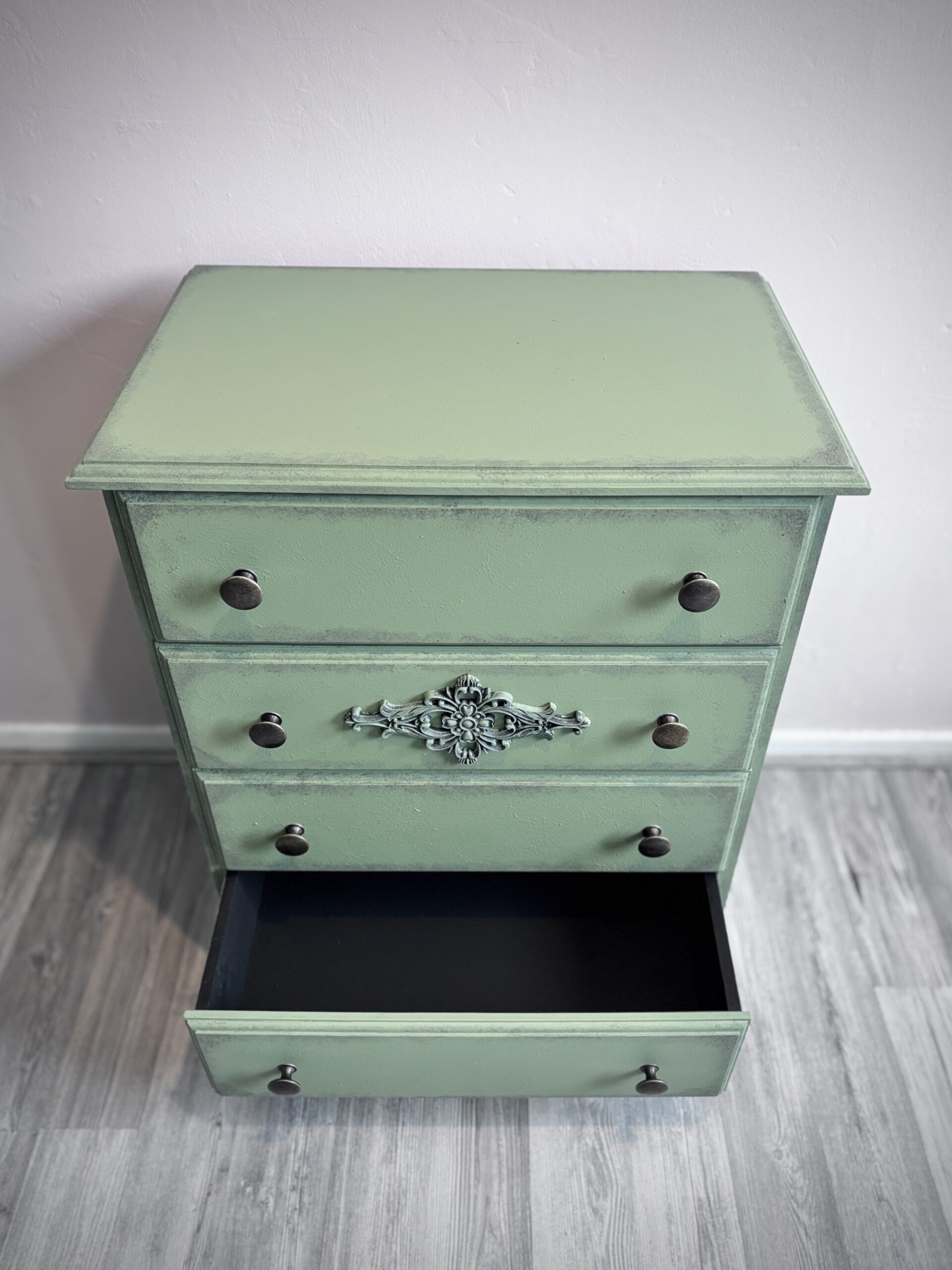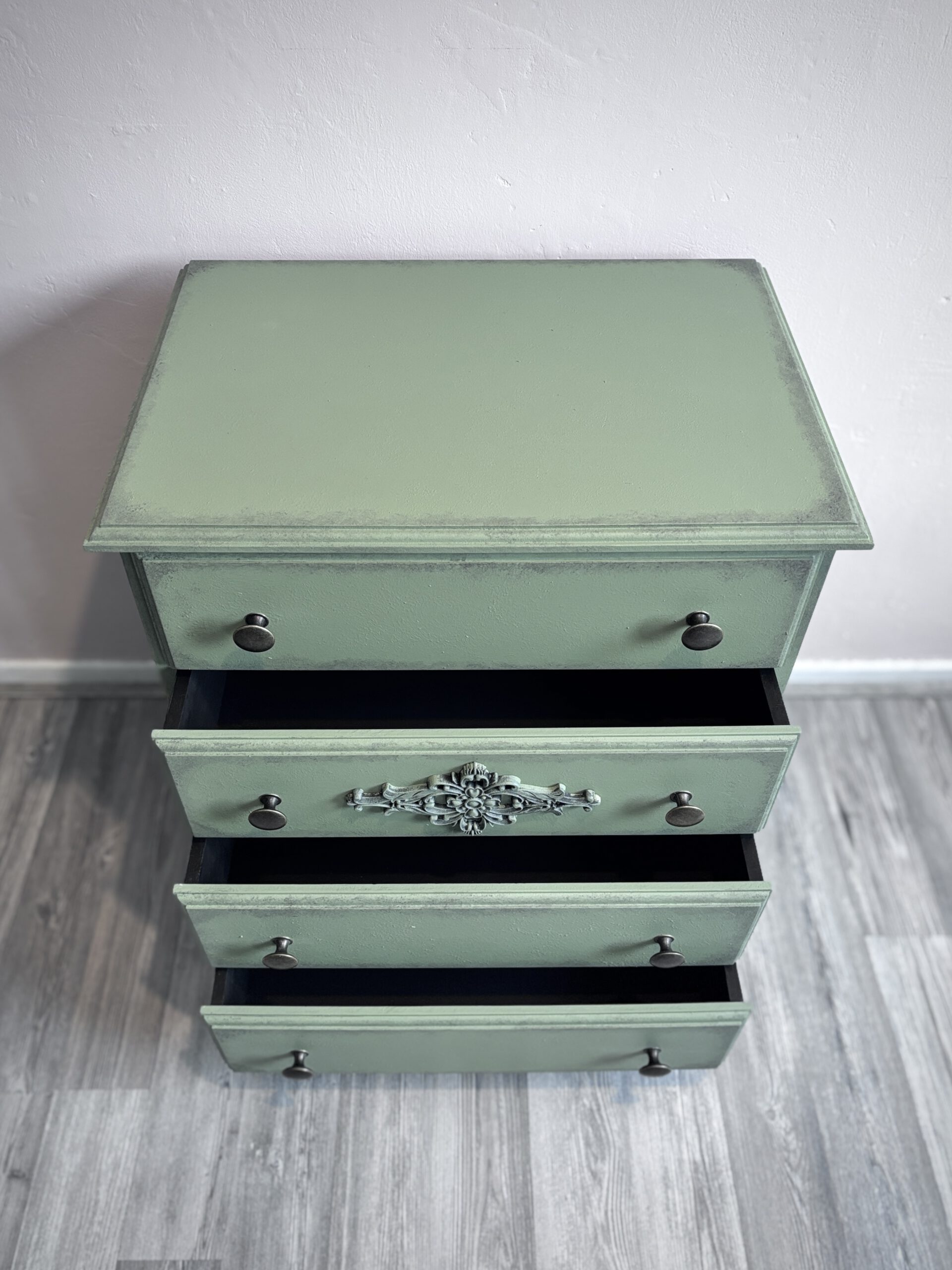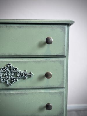 Er is meer textuur aangebracht op de kastjes en ze zijn subtiel verouderd met een verftechniek, wat zorgt voor een zachte, doorleefde look. De warme bronzen knoppen vormen een prachtig accent tegen het groen. Elk kastje heeft vier ruime lades – perfect voor het opbergen van boeken, een tablet of andere benodigdheden.