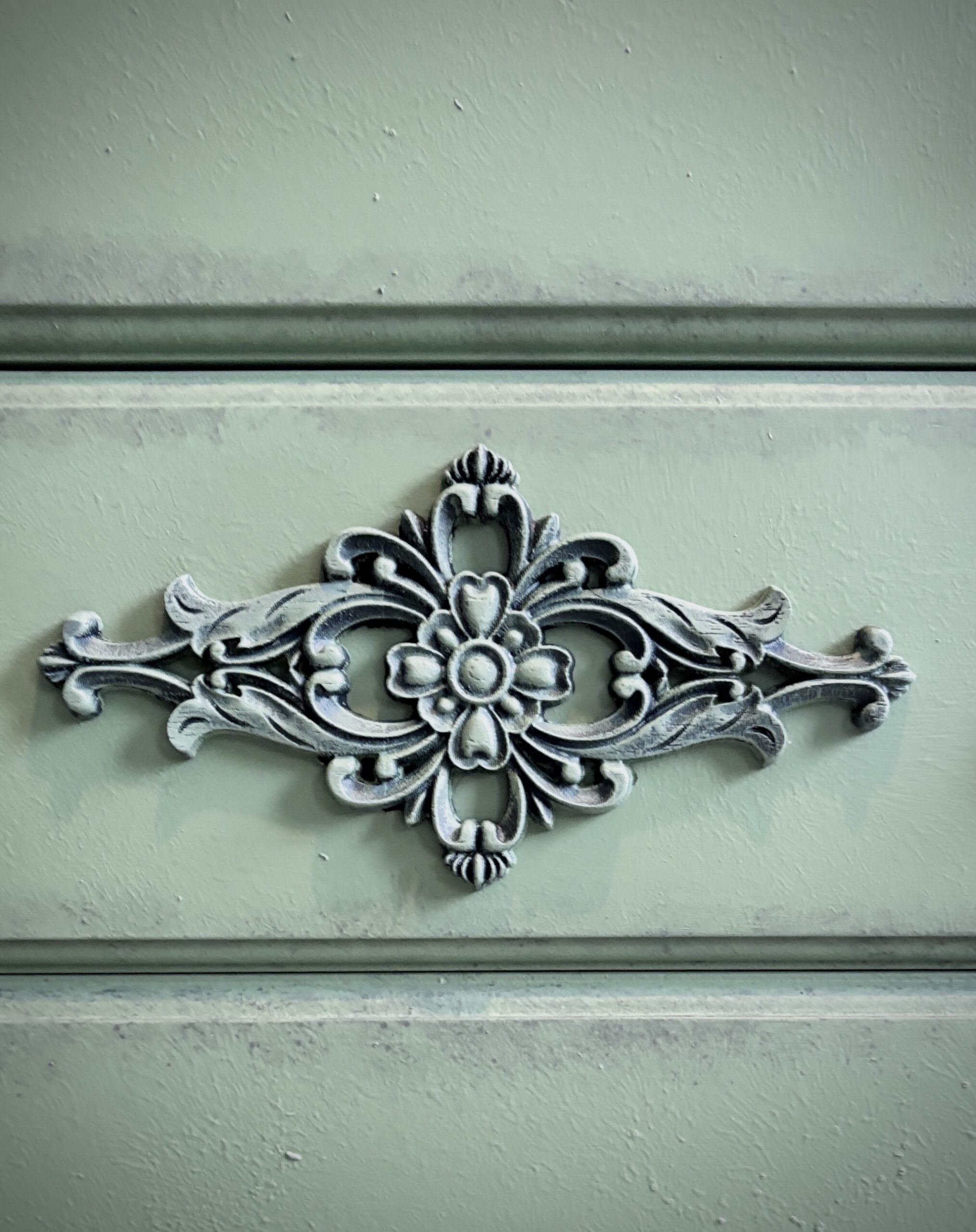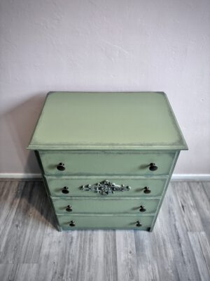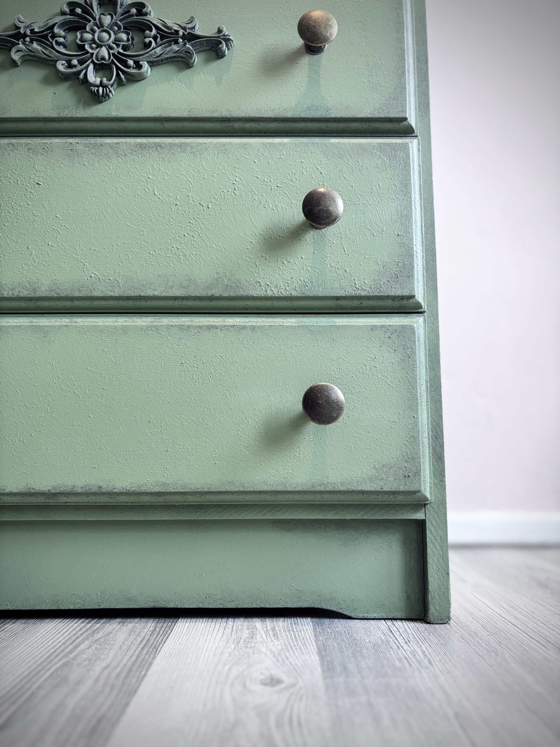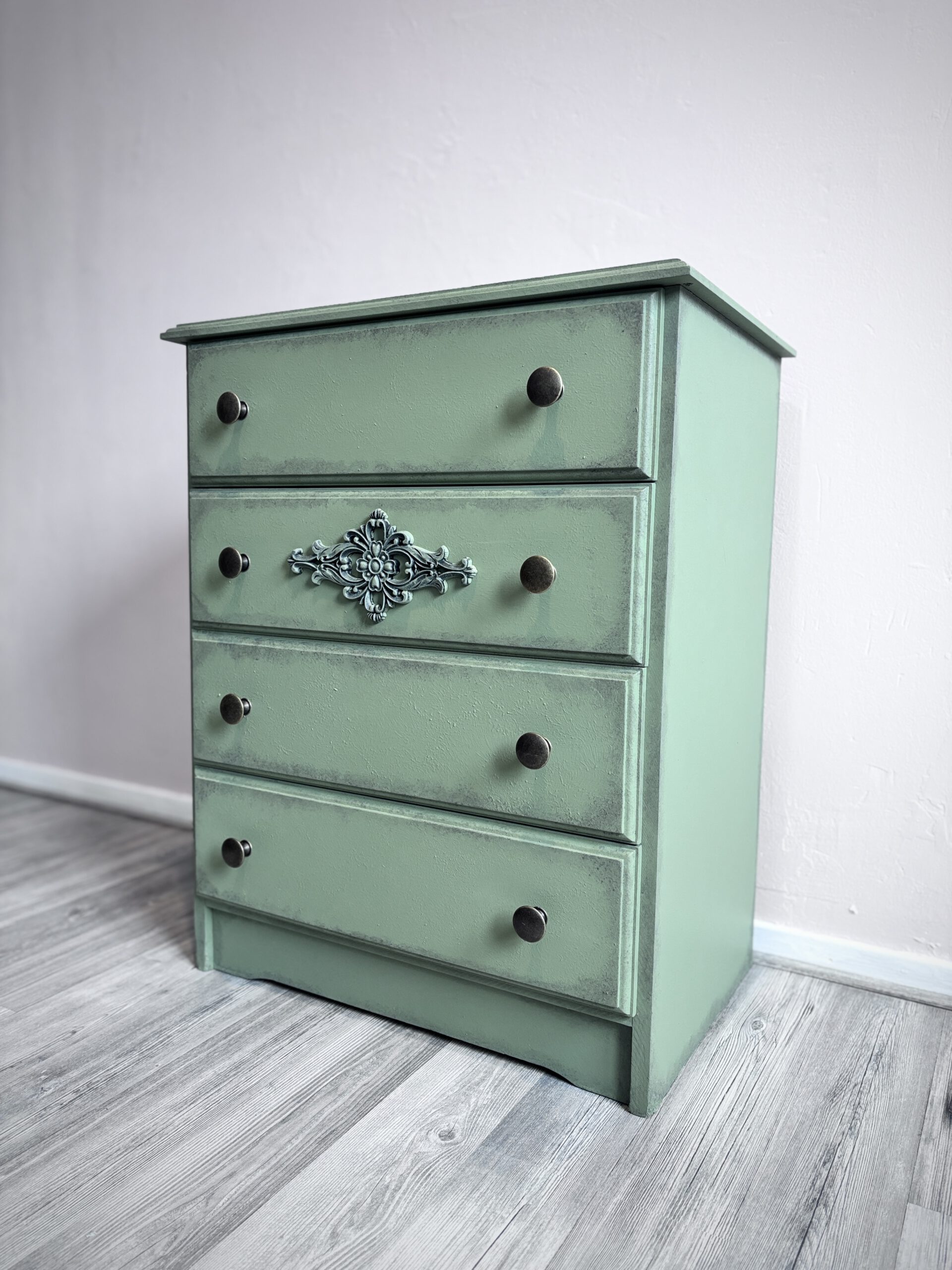 Er is meer textuur aangebracht op de kastjes en ze zijn subtiel verouderd met een verftechniek, wat zorgt voor een zachte, doorleefde look. De warme bronzen knoppen vormen een prachtig accent tegen het groen. Elk kastje heeft vier ruime lades – perfect voor het opbergen van boeken, een tablet of andere benodigdheden.
