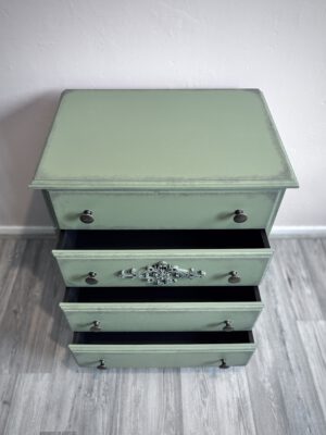 Deze elegante set van twee nachtkastjes is geverfd in een verfijnde zachtgroene kleur. De binnenkant van de lades heeft een matzwarte kleur. De combinatie van het zachte groen aan de buitenkant en het diepe zwart aan de binnenzijde zorgt voor een subtiel maar krachtig contrast, terwijl de kleuren toch mooi met elkaar harmoniëren.